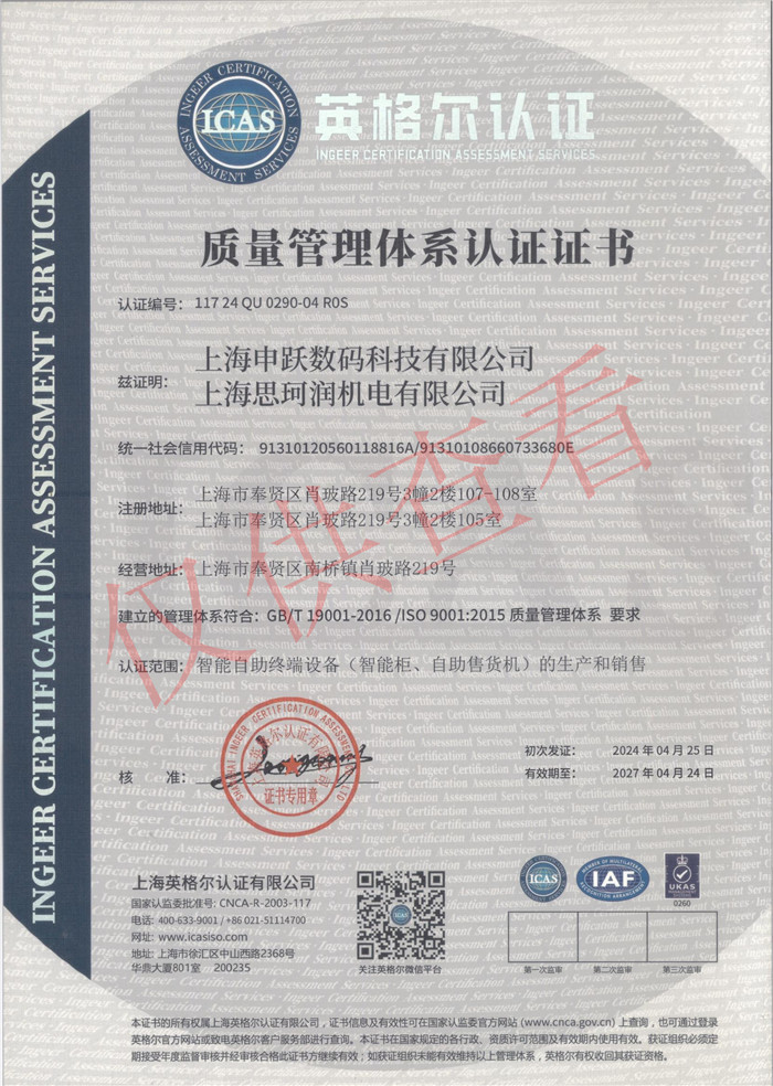 上海思珂潤(rùn)機(jī)電有限公司,成立于2007年是一家以智能自助終端設(shè)備(無(wú)人售貨機(jī)、智能打印機(jī)、智能存儲(chǔ)柜等),顯示終端(廣告機(jī)、電子閱報(bào)欄、拼接屏等)集合數(shù)字顯示系統(tǒng)、報(bào)業(yè)互動(dòng)多媒體信息發(fā)布系統(tǒng)、自助管理應(yīng)用平臺(tái)的產(chǎn)業(yè)。公司集研發(fā)、設(shè)計(jì)、生產(chǎn)、售后于一體的集團(tuán)式生產(chǎn)型企業(yè)。集團(tuán)旗下有上海申躍數(shù)碼科技有限公司,上海堃鋌電器制造有限公司,河南凱歌科技產(chǎn)業(yè)有限公司,上海適之信息科技有限公司,是具備箱體設(shè)計(jì)、精工生產(chǎn)、智能應(yīng)用軟件開(kāi)發(fā)能力的大型集團(tuán)式生產(chǎn)制造商。公司具備強(qiáng)大的專(zhuān)業(yè)設(shè)計(jì)力量,積極拓展定制業(yè)務(wù),為用戶(hù)量身定制專(zhuān)業(yè)級(jí)液晶顯示終端和智能自助終端設(shè)備......